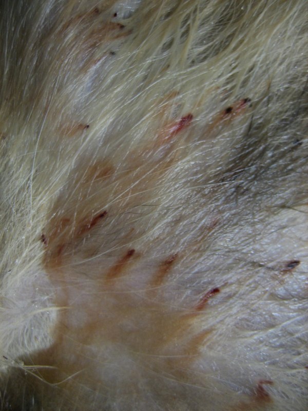 Vous ne verrez pas nécessairement de puces adultes sur le pelage, mais en général vous remarquerez la présence de petits points noirs dans les zones claires du pelage : ce sont les excréments de puces.